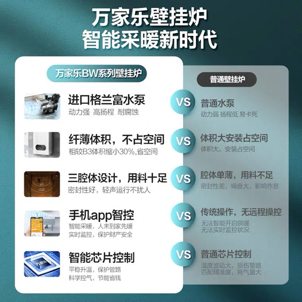 万家乐壁挂炉是万家乐供暖系统中的核心产品,炉体积小、质量轻,方便运输安装,无需高大锅炉房,减少锅炉房造价;铸铁制造,经久耐用;既可单独运行,又可并联组成专业的供热系统;控制系统完善,运行安全可靠;清洁、环保、低噪音。